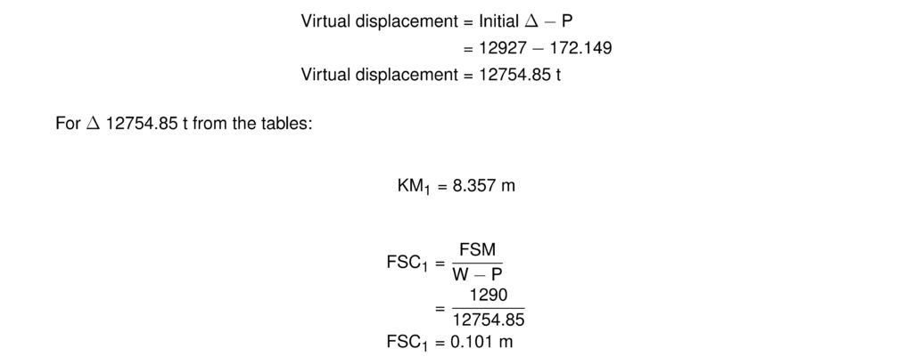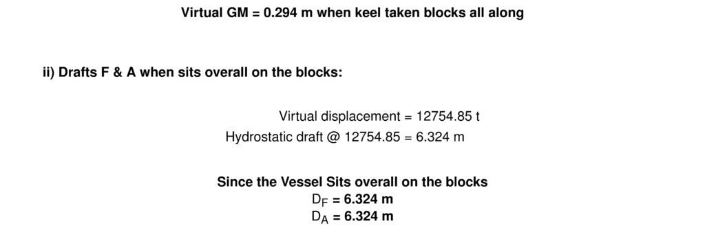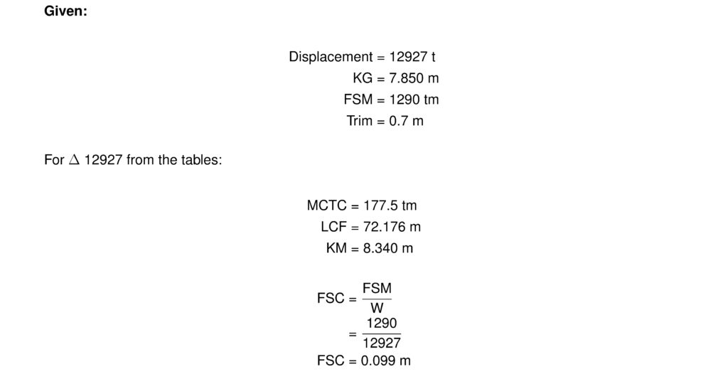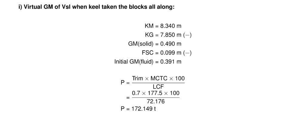 Q.3. M.V. Hindship displacement 12927 T, KG 7.850 m, FSM 1290 TM, is trimmed 0.70 m by the stern. She has to be dry-docked. Calculate: