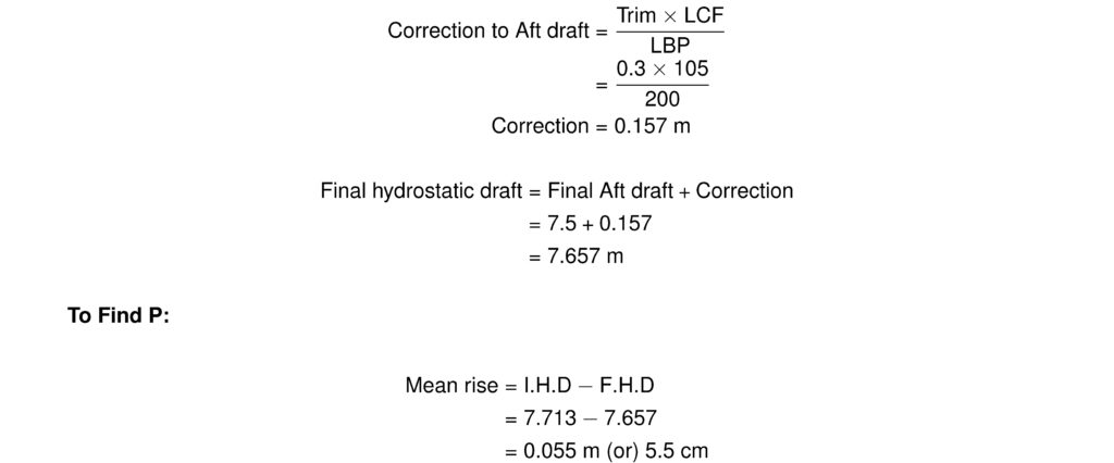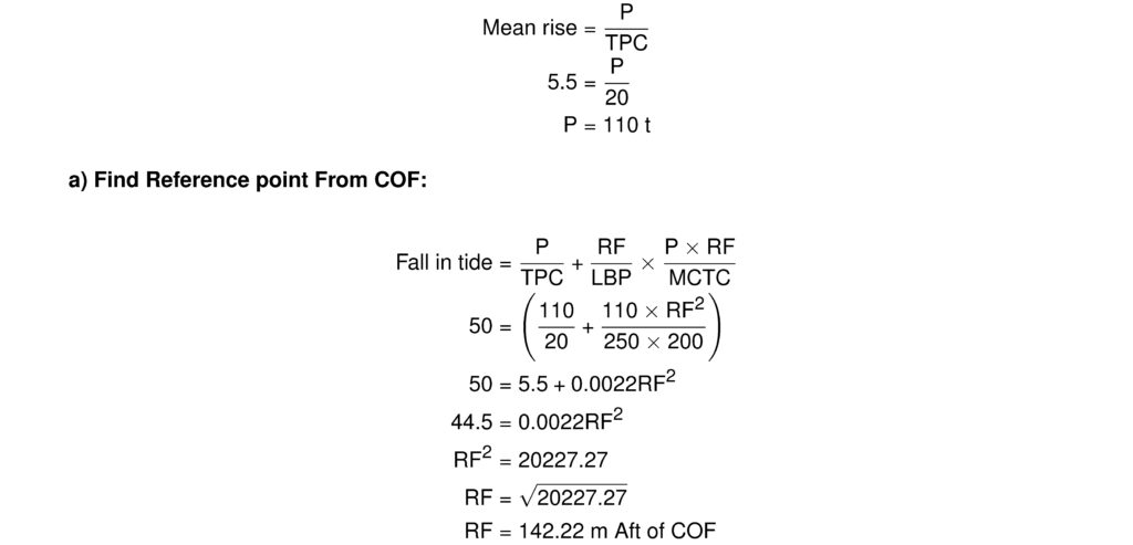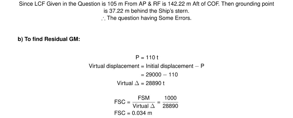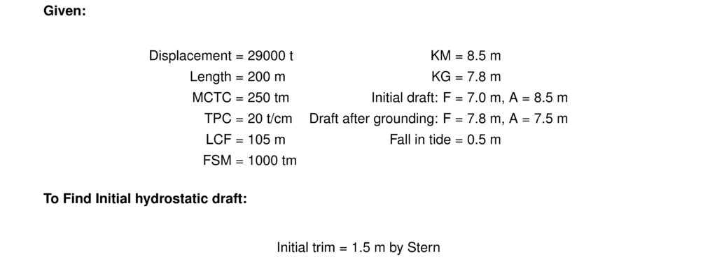 Q.1 A vessel of displacement 29,000 t, length 200m, Fwd draft 7m and Aft Draft 8.5m runs aground without any damage to her hull. Her MCTC 250 tm/cm and TPC 20 t/cm, LCF 105m, FSM 1000 tm, KM 8.5m, KG 7.8m. Tide then falls by 50 cm. The drafts then observed were to be Fwd 7.8m and Aft 7.5m. Calculate with reference to COF:
