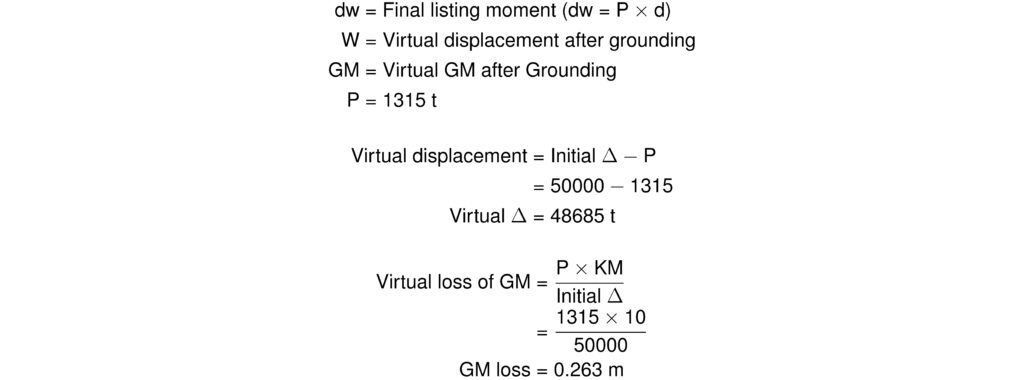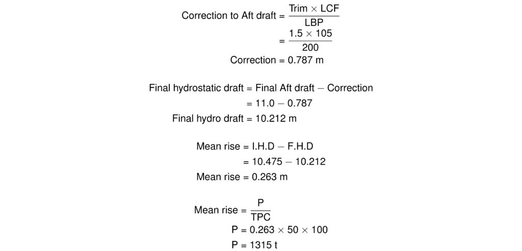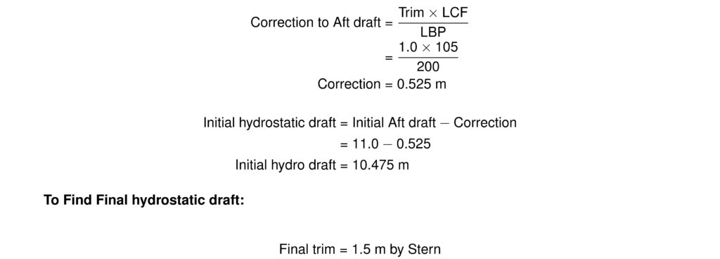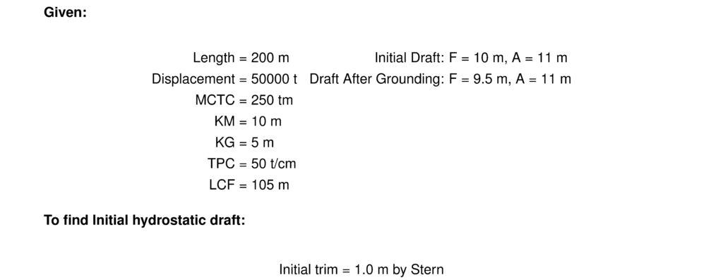 Q.2 A ship of L = 200 m, W = 50000 T, MCTC = 250 T-m, KM 10 m, KG 5 m, TPC = 50 T, LCF 105 m, draft F 10.0 m, A 11.0 m, grounds lightly on an isolated rock in falling tide. At low water, the drafts are found to be F 9.5 m, A 11.0 m, Calculate the following: