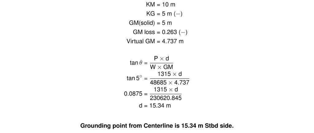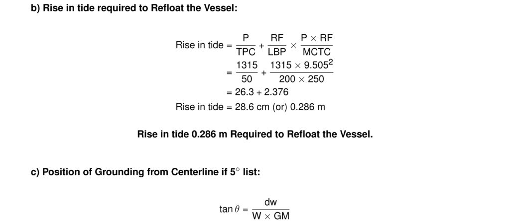 c) Position of grounding from the centerline, if ship listed 5° to port at low water.
