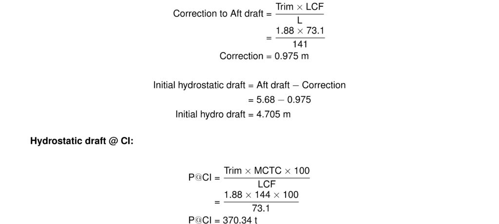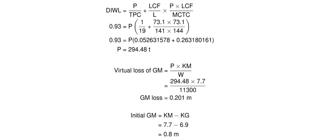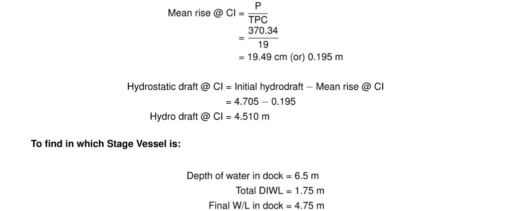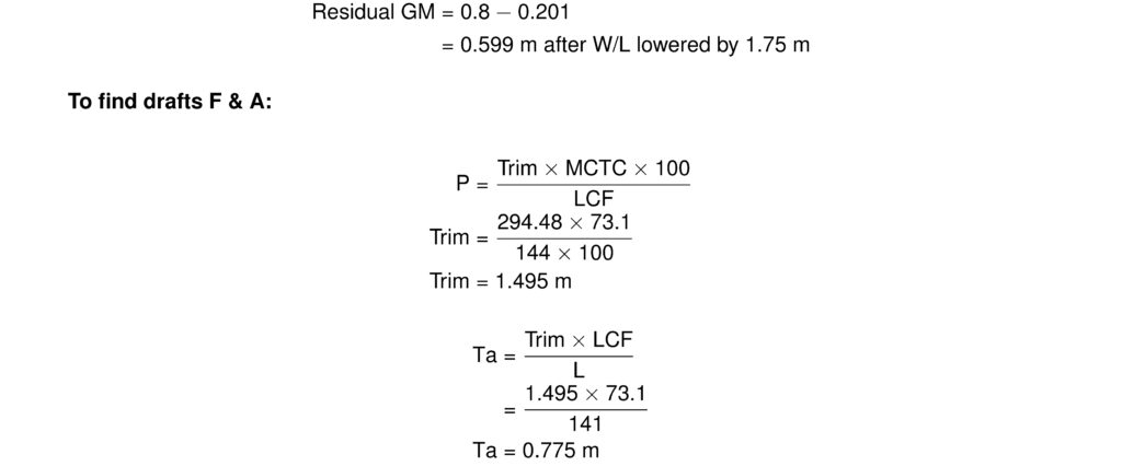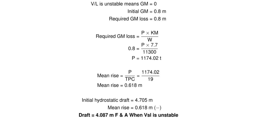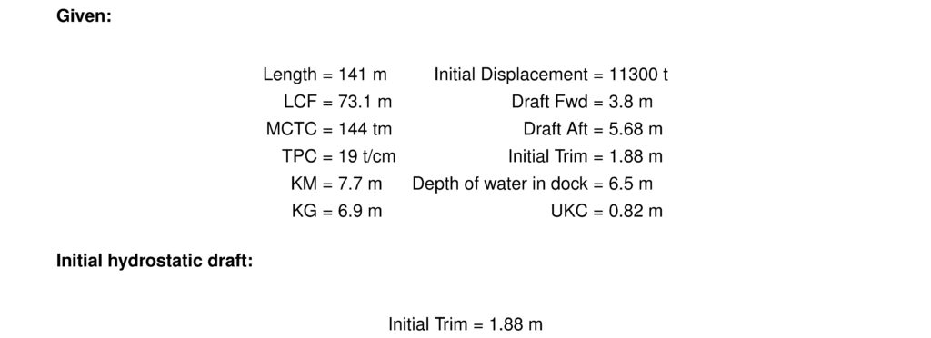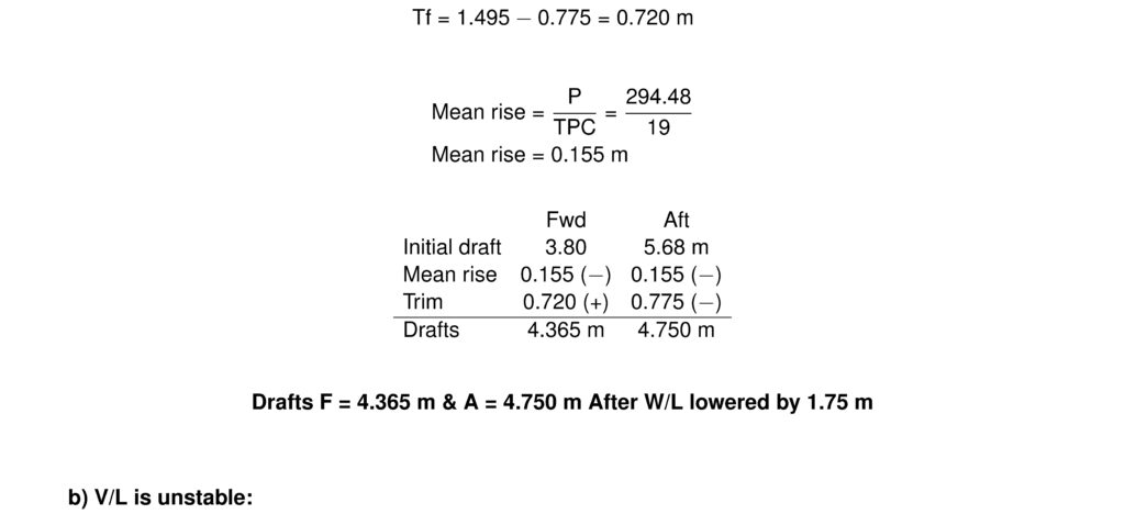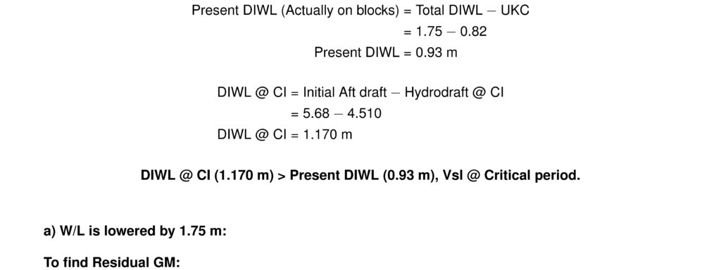 Q.1 A vessel of length 141 mtrs, CoF = 2.6 mtrs, forward of midship, MCTC = 144, TPC = 19, KM = 7.7m, KG = 6.9m, w = 11300 T, at a dft F = 3.80m, A = 5.68m is floating in a dry dock where depth of water is 6.5m above the top of the blocks. Calculate vessels residual GM and drafts F & A. When:- a) W/L is lowered by 1.75m, and b) V/L is unstable.