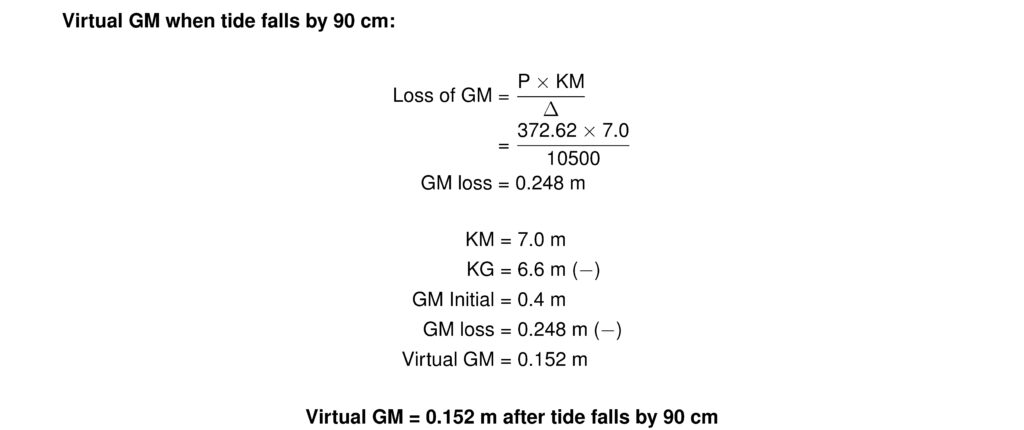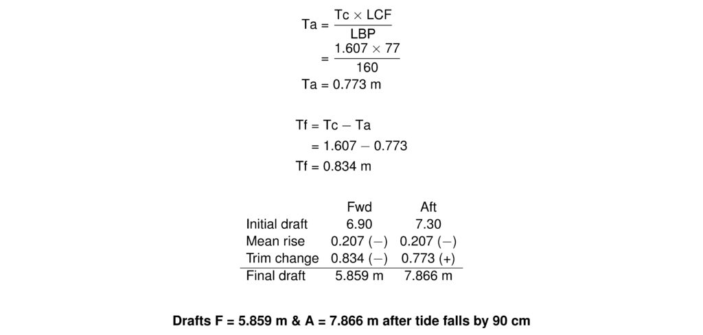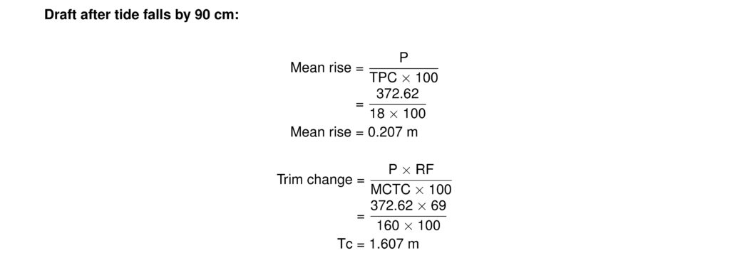Q.2 A ship of length of 160m, disp W = 10500t, CF = 3m abaft the midship, in MCTC = 160mt, TPC = 18t, KM = 7.0m, Kg = 6.6m at draft of 6.9m forward, 7.3m aft, grounds lightly on a rock 14m abaft the fore end. The tide then falls by 90cm. Calculate her virtual GM and drafts forward and aft then.